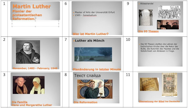 Next, the authors focused on the consideration of a specific topic - the Reformation - and described the stages of work on it (these steps will be described in the next part "Discussion"). Work on other topics was lined up in the similar way. The prerequisite was the attraction of authentic material, which helped to learn not only the essence of significant events from the history of the country, but also revealed the cultural and national characteristics of the country of the target language.