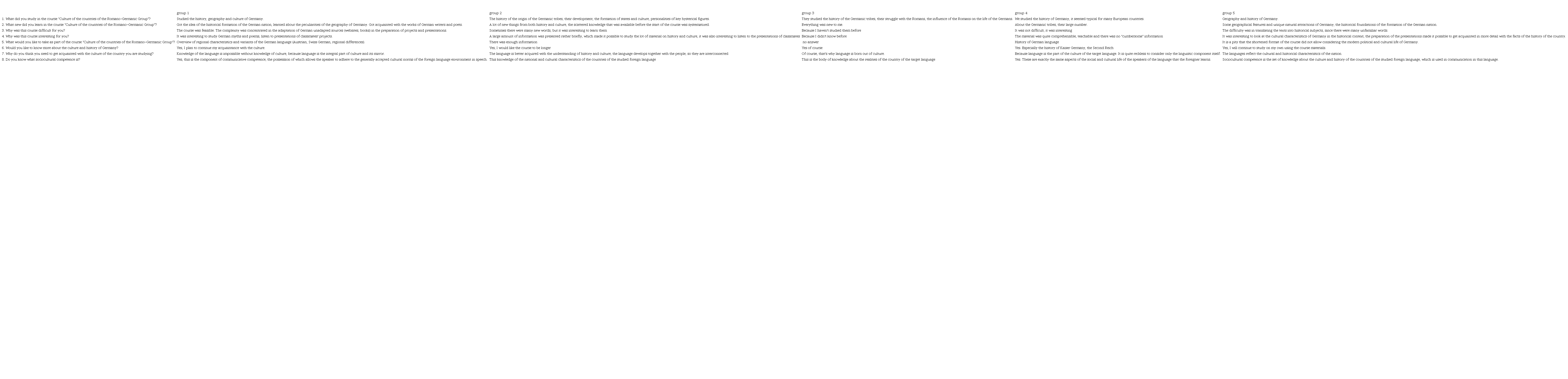 Answering the first question (What did you study in the course?), the students named not only areas (culture, geography, history), but about specific topics (the life of the Germanic tribes, their struggle with the Romans), as well as some typical patterns of development of European countries ("seemed typical for many European countries").