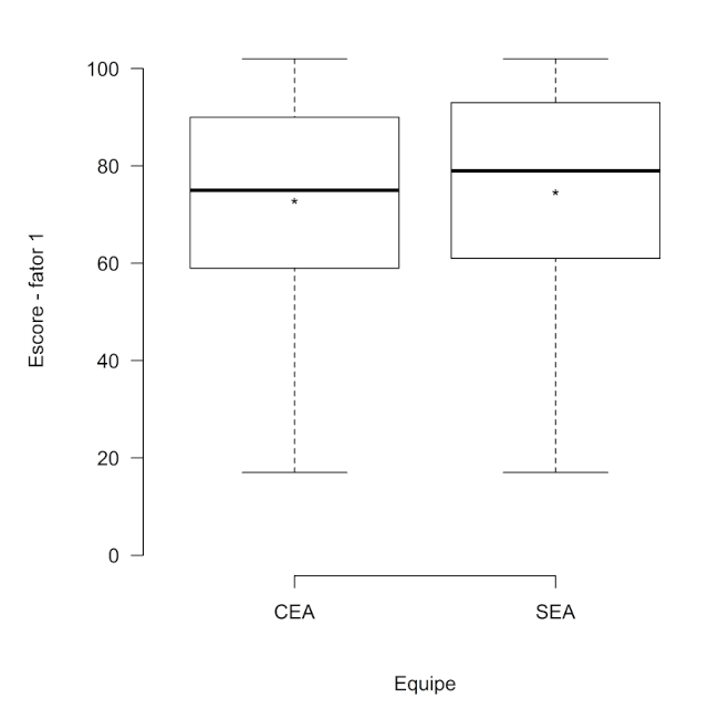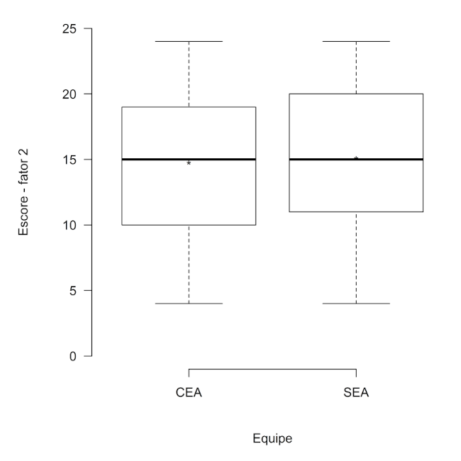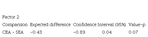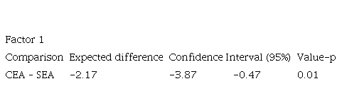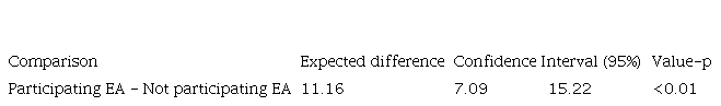 Analyzing the values found, we can say that, even though the data point to a negative difference between the CEA and SEA groups, in beliefs to help in bullying situations, the value of the estimated difference (-2.17) is very low, compared to the total score that the participants could achieve.