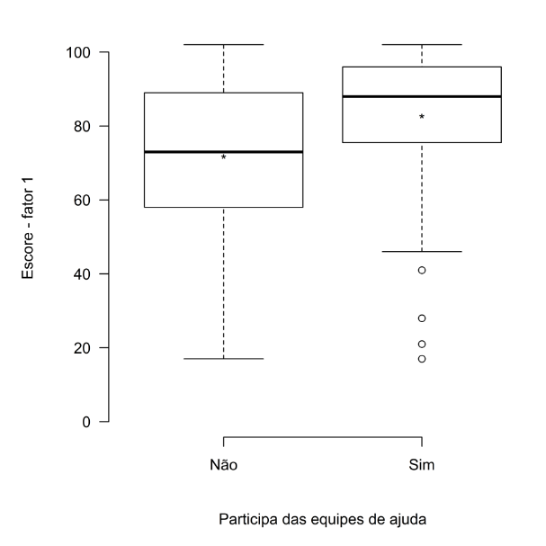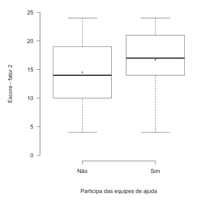 From this analysis, two scores were composed, one for each factor, by adding the answers of the items corresponding to each factor. The higher the score, the greater the person's ability to help his/her friend in that situation. Taking into account that each of the questions had six levels (from 1 to 6) that could be marked, we have, then, that in F1 a student could reach from 17 to 102 points, and in F2, from 6 to 24.