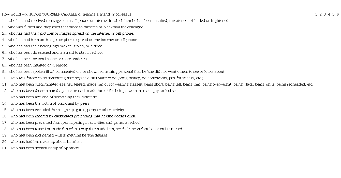 There are 21 questions, representing different types of bullying experienced by students at school that constitute a 6-point Likert scale, where 1 indicates "completely unable" and 6 "completely able". As shown in the following frame:
