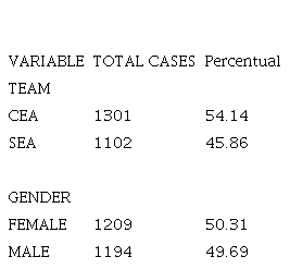 Are there differences in self-efficacy beliefs to help in bullying situations between students in schools where SAI has been implemented and others where such work does not exist? And also: Are there differences in beliefs to help between students who are part of the teams and those who are not? These were the questions that generated the analysis and the questions in this research. To this end, we composed two samples, as described above: the group CEA (With Help Teams), which is composed of 1,301 subjects from schools that have the SAI implemented, and the group SEA (Without Help Teams), with 1,102 subjects from schools that do not have the system, as shown in the following table: