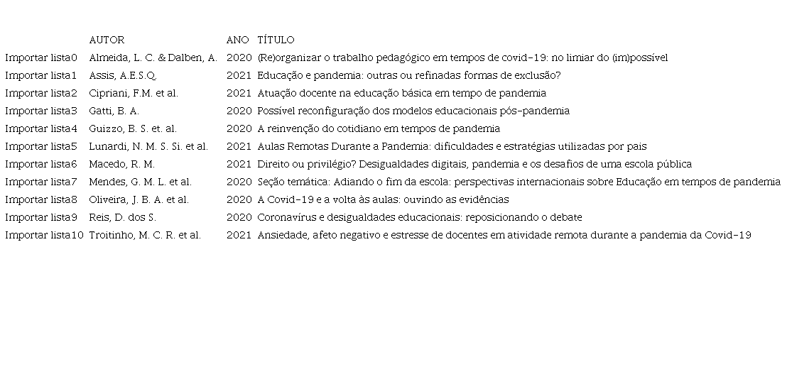 For a better understanding of the predominant approaches in the selected academic production, it was decided to divide the theme into five axes, namely: (a) Management and (re)organization of pedagogical work; (b) Connectivity and other exclusion factors; (c) Teaching in remote teaching; (d) Remote classes and the difficulties and strategies used by family members; and (e) Possible reconfiguration of post-pandemic educational models and the future of the school.