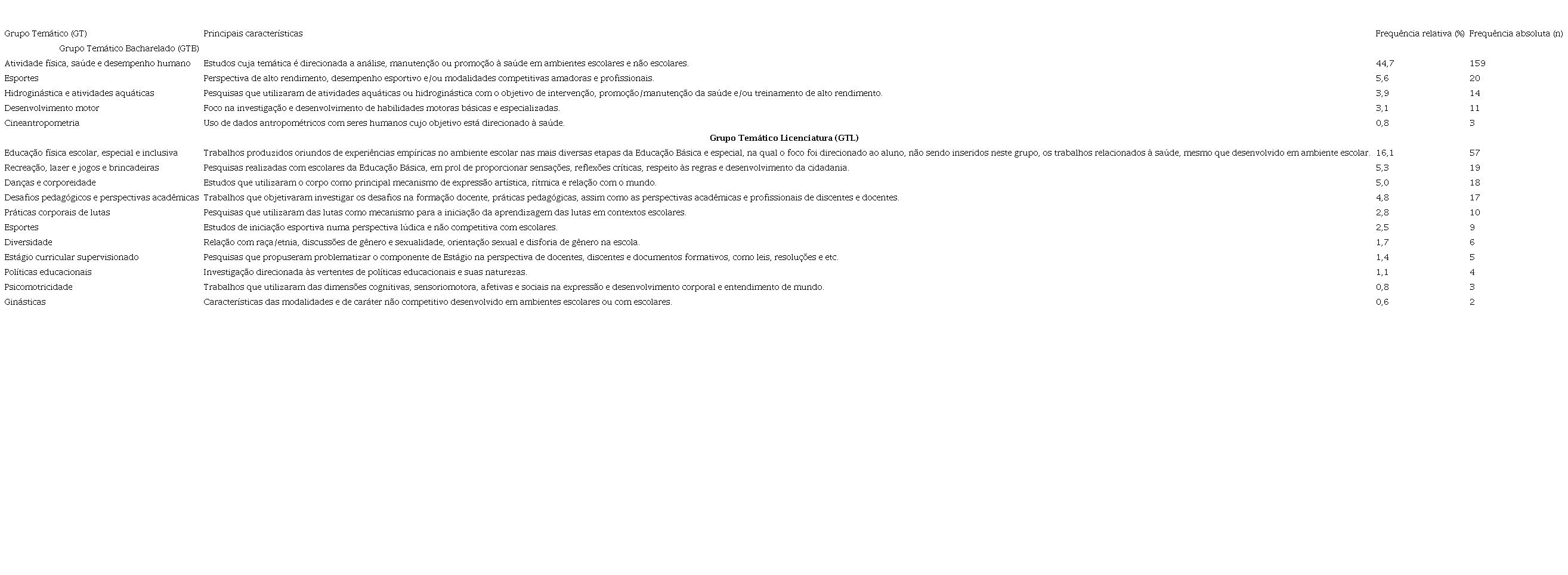 Ao identificarmos as temáticas de produção acadêmica, agrupamos os trabalhos em duas seções de grupos temáticos (GT’s), sendo elas: Grupo Temático Bacharelado (GTB), na qual alocamos as produções referentes ao treinamento físico, desempenho humano, saúde e afins e Grupo Temático Licenciatura (GTL), direcionando os trabalhos cuja temática fosse desenvolvida a partir de uma perspectiva educacional, tais como a Educação Física escolar, especial e inclusiva, esporte “na” e “da2” escola e etc. Os GT’s podem ser observados na Tabela 2.