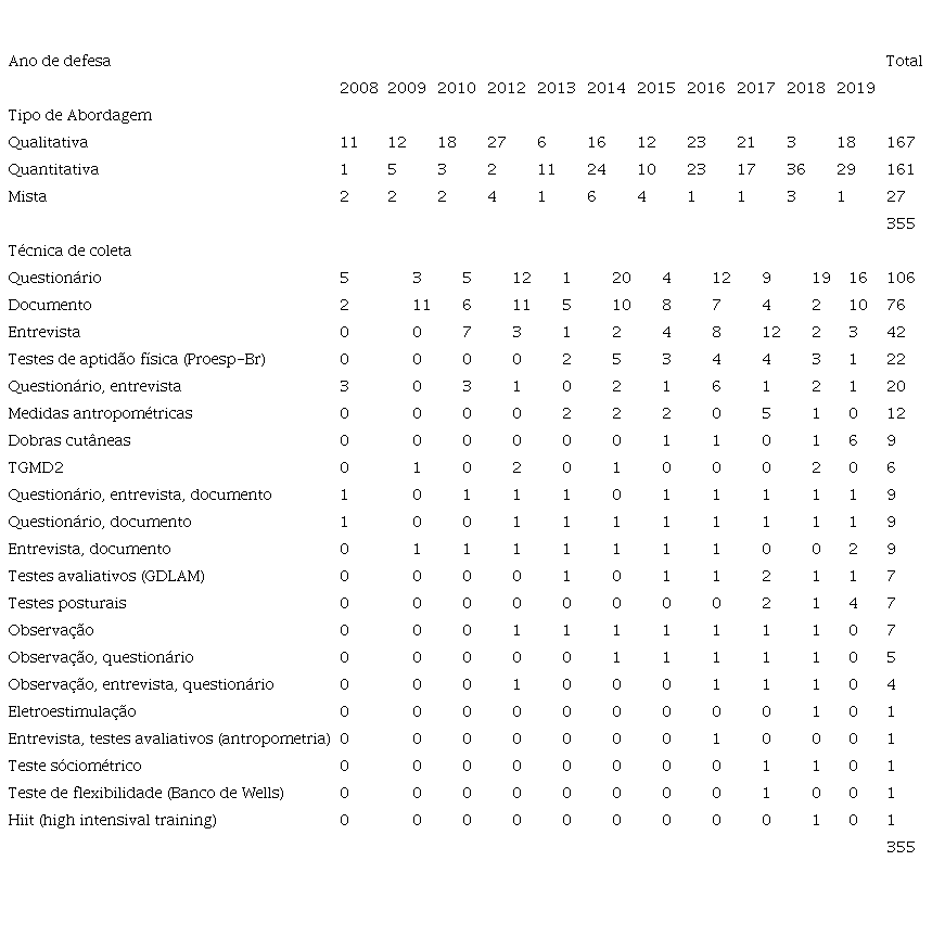Apresentamos na tabela 3, o ano de defesa dos TCC, o tipo de abordagem de pesquisa e as técnicas de coleta de dados utilizadas nas produções acadêmicas do curso de licenciatura em Educação Física da URCA/UDI no decorrer do recorte temporal 2008/2019.