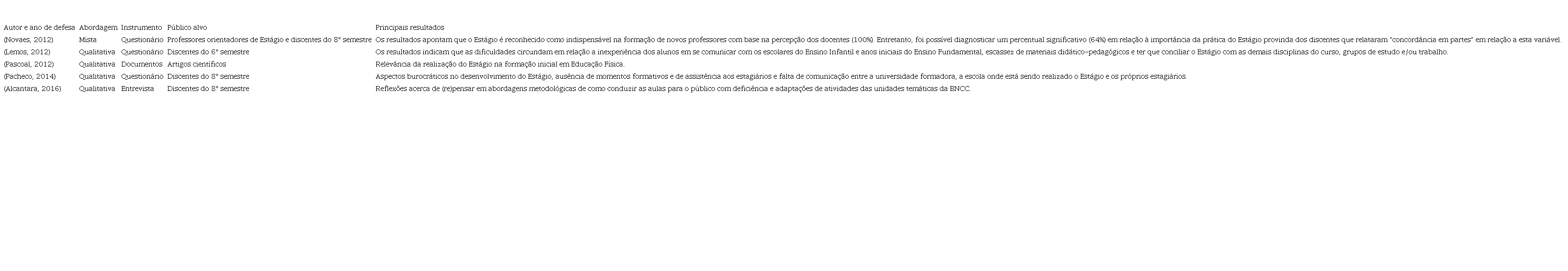 Finalmente, o quinto estudo, de Alcantara (2016), teve como objetivo elencar as contribuições do Estágio V (Educação Especial) para a atuação do professor de Educação Física na percepção dos discentes do VIII semestre. A pesquisa é de abordagem qualitativa e o instrumento utilizado para coletar os dados foi a entrevista semiestruturada a partir da formulação de três questões norteadoras. Participaram 18 discentes concluintes e o método analítico utilizado foi a análise de conteúdo.