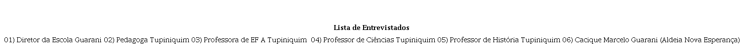Em meio a esse cenário, vivenciamos dificuldades relacionadas ao acesso e sinal de internet de rede na comunidade Guarani. Esse foi um dos principais motivos para adesão limitada do grupo. Além disso, segundo os nossos informantes, os atores sociais da escola estavam atarefados com as novas demandas da rotina de ensino em modo remoto4. Ou seja, segundo eles, a jornada de trabalho triplicou. Mesmo com todos os desafios, foi possível dar andamento ao trabalho e, abaixo, apresentamos os sujeitos que participaram das entrevistas (presencial ou online) e suas respectivas identificações nesse estudo.