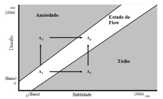 Seguindo o raciocínio dos autores, pode-se identificar que o indivíduo atinge seu estado de Flow em dois momentos: A1 e A4, de forma igualmente agradáveis. A diferença entre os momentos reside nas habilidades adquiridas. Ao atingir o pleno estado de Flow o sujeito percebe que sua habilidade corresponde ao nível do desafio proposto e, dessa forma, a motivação se torna o estímulo que o faz manter-se no seu estado, sempre buscando aumentar o nível de complexidade.
