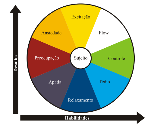 Fluxo: é o momento que a atividade atinge um nível de desafio difícil e o indivíduo tem a consciência de que possui muita habilidade em relação ao que está sendo proposto e a realiza com satisfação.
