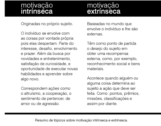 Motivação intrínseca: representa a recompensa por estar realizando a atividade e não no que ela irá trazer como recompensa. Essa característica também é considerada como experiência autotélica, que tem por objetivo principal, atingir o prazer sem a expectativa de algum benefício futuro.