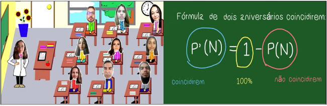 O vídeo “A Matemagia dos Aniversários” (Figura 1), disponível em https://youtu.be/wVRBcovZHvs, possui 5 minutos e 59 segundos e aborda o conteúdo de Probabilidade. A narrativa é de natureza cênica/animação, na qual é representada uma sala de aula tradicional, sendo a narração feita pelos próprios licenciandos (cada um narra seu próprio avatar). O problema proposto parte do interesse dos estudantes e se refere ao cálculo da probabilidade de duas pessoas fazerem aniversário no mesmo dia. Alguns alunos discutem possíveis soluções do problema e, em seguida, a explicação detalhada da resolução é narrada e apresentada em uma lousa à audiência. O vídeo apresenta outras possibilidades de quantidades de alunos em uma sala de aula e suas respectivas probabilidades de soluções. Além disso, a animação leva a aprendizagem para fora do espaço escolar, mostrando um levantamento de dados feito pelos autores através de uma rede social utilizando uma enquete. Dez licenciandos participaram da produção, roteiro, animação e edição. Do ponto de vista matemático, o vídeo explora conteúdos de probabilidade. De acordo com a Base Nacional Comum Curricular, os conteúdos explorados no vídeo mobilizam a seguinte habilidade: “(EF08MA22) Calcular a probabilidade de eventos, com base na construção do espaço amostral, utilizando o princípio multiplicativo, e reconhecer que a soma das probabilidades de todos os elementos do espaço amostral é igual a 1” (Brasil, 2018, p. 35).