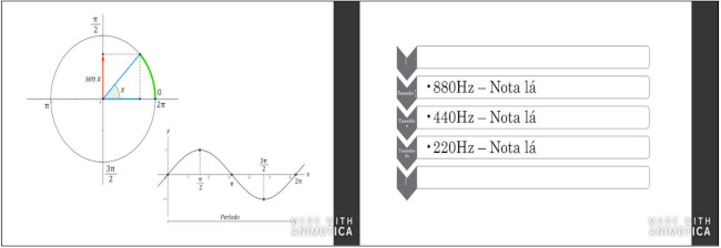 O vídeo “Ondas Sonoras e Funções Trigonométricas” (Figura 3), disponível em https://youtu.be/bWP27H4t2t8, possui 5 minutos e 50 segundos, é apresentado de forma cênica abordando o conteúdo de Ondas Sonoras e Funções Trigonométricas. No início do vídeo dois amigos conversam, através de uma chamada de vídeo, sobre acordes de violão e acabam discutindo ideias sobre funções trigonométricas e ondas sonoras, exemplificando através do som da corda do violão. Além da exemplificação sobre notas musicais através do som do violão, o vídeo traz uma narrativa acompanhada de imagens à explicação sobre frequência e cita que foi Pitágoras que observou essas relações ao observar ferreiros martelando bigornas em uma oficina. A narrativa aborda o conceito de fenômenos periódicos encontrados nas funções trigonométricas estudadas de forma aprofundada pelo matemático Jean Fourier (1768 - 1830). Oito participantes compuseram o grupo que desenvolveu o vídeo. Do ponto de vista matemático, o vídeo explora conteúdos sobre trigonometria e funções trigonométricas. De acordo com o Currículo Paulista, o vídeo oferece meios para explorar a seguinte habilidade: “(EM13MAT306) Resolver e elaborar problemas em contextos que envolvem fenômenos periódicos reais (ondas sonoras, fases da lua, movimentos cíclicos, entre outros) e comparar suas representações com as funções seno e cosseno, no plano cartesiano, com ou sem apoio de aplicativos de álgebra e geometria” (Brasil, 2018, p. 536).