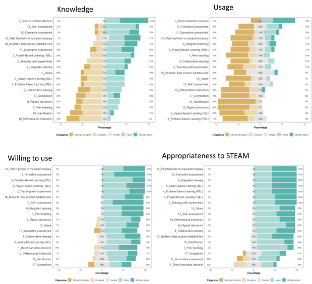 18 educational approaches were aggregated into a single scale variable ranging between 18 and 90 (survey I, part A). This variable was repeatedly measured on different dimensions: Knowledge, Usage, Willing to use, and Appropriateness to STEAM. On the dimension of Knowledge, for example, the greater the value of this variable, the more teachers agree on knowing a large variety of educational approaches.
