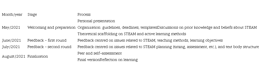 Considering all that, a four-month practical teacher-training program on STEAM activity planning was enrolled in Brazil. During this formation, teachers shared their prior knowledge and beliefs about STEAM. Then, they received guidelines and templates for planning STEAM activities. In parallel, lessons and mentoring intended theoretical scaffolding on STEAM and active learning teaching methods. After two feedback sessions from the mentor teacher over their STEAM planning. Finally, teachers underwent peer and self-assessment processes using a rubric to verify STEAM plans alignment. The course ended with a reflection session about their learning.