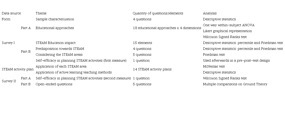 In part B of survey I, we used descriptive statistics of a list of 15 possible positive STEAM impacts, and four items about predisposition towards STEAM. After, a Friedman test verified differences in teachers' self-efficacy in considering each STEAM knowledge area in the STEAM plans. The question about general self-efficacy in planning STEAM activities was reserved to be used afterwards in a pre-post-test design.