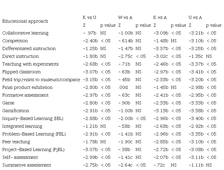 Last, Wilcoxon Signed Rank tests were run regarding Usage and Appropriateness to STEAM. Most approaches show significant differences. They were calculated based on positive ranks. By the order of the test, it denotes teachers attributed higher rates to Appropriateness to STEAM than its Usage.