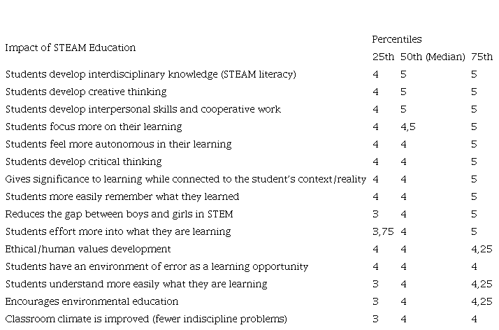 Teachers' opinion on STEAM Education's impact was evaluated through a list of 15 items. Table 4 list them in a rank order, starting from the most positively evaluated. We highlight the medians of all aspects lay in the values 4 (Agree) and 5 (Strongly agree). This result points to teachers’ overall positive evaluation of STEAM Education's impact.