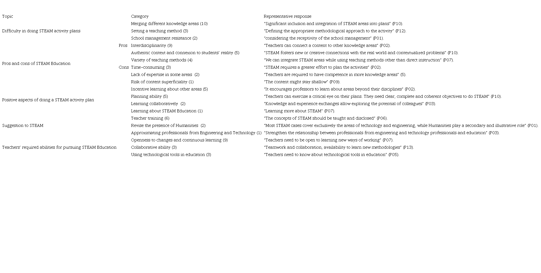 From a more qualitative perspective, five open-ended questions explored the process of planning STEAM activities (part B of survey II). In Table 5, each question is presented as a topic followed by the categories induced from data and its representative responses.