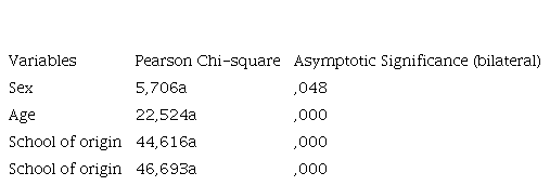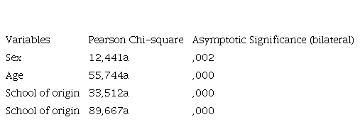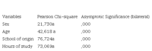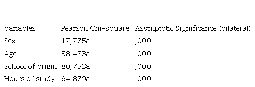 In table 7, the academic goals are associated with sex, age, school of origin, and hours of study as evidenced in the independence test (Chi-square x2 = 17,775ª, 58,483ª, 80,753ª, and 94,879ª respectively), and p< 0.05, so the alternate hypothesis is accepted and the null hypothesis is rejected; establishing that personal conditions are associated with the academic goals of students from a private university, 2020.