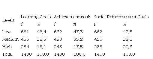 With regard to Table 2, 49.4% of students presented a low level; 32.5%, a medium level and 18.1%, a high level of learning goals; in achievement goals, 47.3% showed a low level, 35.2%, a medium level and 17.5%, a high level; in the social reinforcement goals dimension, 47.3% showed a low level, 32.1%, a medium level and 20.6% , a high level.