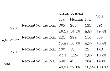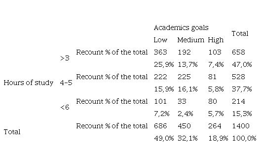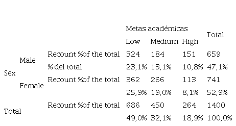 In table 3, it was observed that, of the male sex regarding the academic goals variable, 23.1% presented a low level; 13.1%, a medium level and 10.8%, a high level; in relation to the female sex, 25.9% presented a low level; 19%, a medium level and 8.1%, a high level.