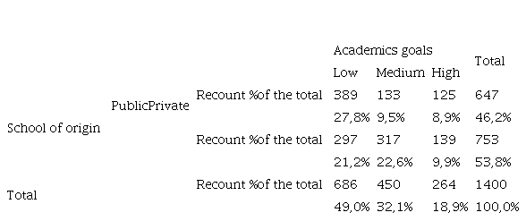 In Table 5, it was observed that of the students from public schools, 27.8% showed a low level; 9.5% showed a medium level and 8.9% a high level; of the students from private schools, 21.2% showed low levels; 22.6% showed a medium level and 9.9% a high level of academic goals.