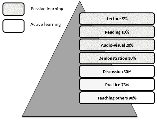 Well-known methods of effective assimilation of educational information developed by J. Martin are reflected in the so-called “Pyramid of learning”. This pyramid received an extremely broad interpretation in the works of psychologists and educators. It is based on 7 methods, among which a lecture is the most ineffective (only 5%) followed by reading (10%), audial methods (20%), videos (30%), discussion (50%), practical use of knowledge (70%), and, finally, teaching others (90%) (Figure 1).