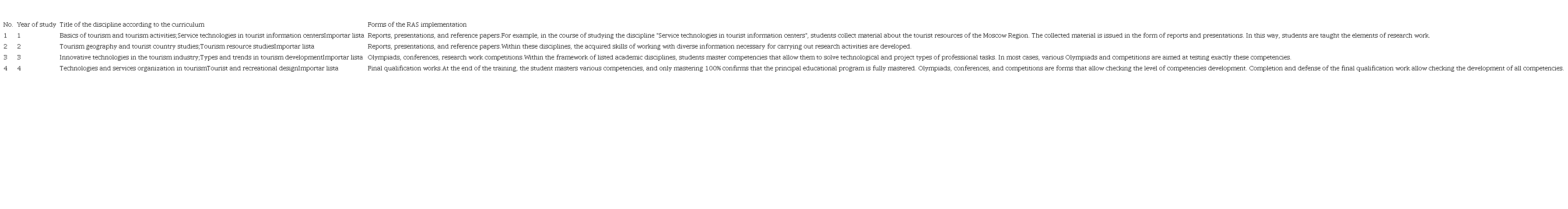 As an example, the curriculum in the training major of Tourism (43.03.02) at the FSBEI of HE “Russian State University of Tourism and Service” was analyzed. In the course of the analysis, academic disciplines were identified, whose study was harmonized most optimally with various forms of research activities of students by solving professionally-oriented tasks (Table 3).