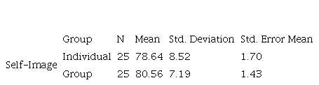 An independent t-test was run to compare the individual and group-based expectations groups’ means on the post-test of self-image in order to probe the first null-hypothesis. Based on the results displayed in Table 2 it can be claimed that the group-based group (M = 80.56, SD = 7.19) had a slightly higher mean on the post-test of self-image than individual expectation group (M = 78.64, SD = 8.52).