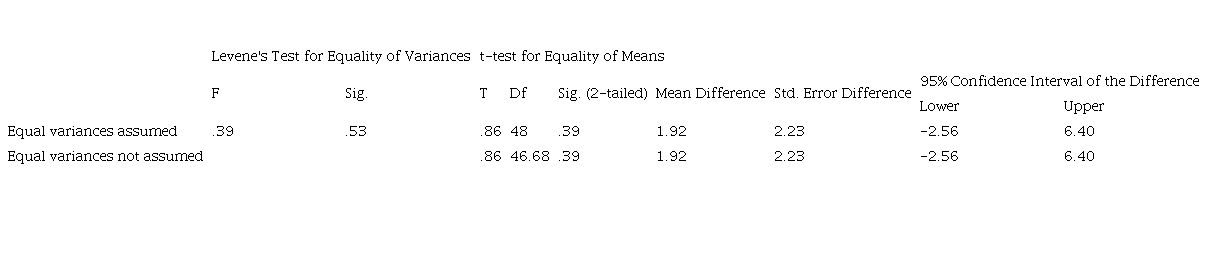 The negative 95 % lower bound confidence interval of -2.56 indicated that the difference between the two groups’ means on the post-test of self-image could have been zero. Thus the above mentioned conclusion as no significant difference between the two groups’ means was correctly made. It should also be noted that the assumption of homogeneity of variances was met (Levene’s F = .393, p = .534). That was why the first row of Table 2, i.e. “Equal variances assumed” was reported.