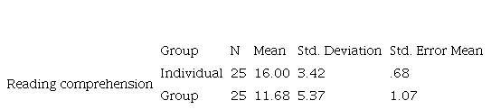 An independent t-test was run to compare the individual and group-based expectations groups’ means on the post-test of reading comprehension in order to probe the second null-hypothesis. Based on the results displayed in Table 4 it can be claimed that the individual expectation group (M = 16, SD = 3.42) had a higher mean on the post-test of reading comprehension than group-based expectation group (M = 11.68, SD = 5.37).