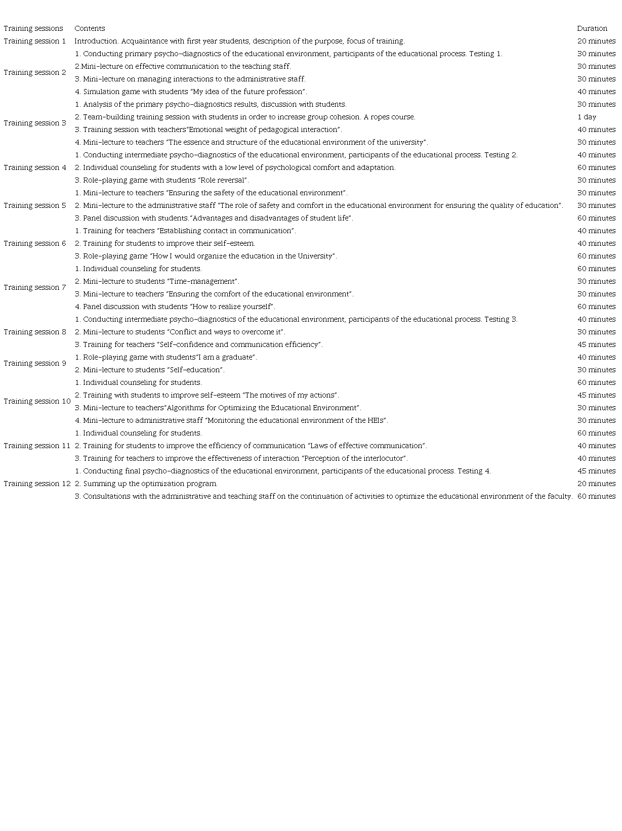 The program of organizing a psychologically comfortable and safe educational environment of the HEIs is aimed at developing the declared parameters and working with all significant subjects of the educational environment: teachers, students and administration. The program includes training sessions, mini-lectures and other forms for the effective organization of a psychologically comfortable and safe environment.