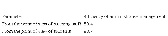 The analysis of the data presented in table 2 allows us to conclude that the efficiency of administrative management is high both from the point of view of teachers and from the point of view of students. The style of management is democratic, which means developed feedbacks between administration, students and teachers. The results of diagnostics prove that the administration is equally sensitive to the problems of teachers and students, which confirms its positive impact on the educational environment of the university.