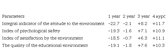 Analysis of the data presented in table 3 allows us to conclude that the shorter the duration of a student’s study at a university, the less safe and comfortable the educational environment for a given subject. This tendency is explained by the fact that the greatest deviation from the average for students’ indicators is observed on the 1st year (downward) and on the 4th year (upward).