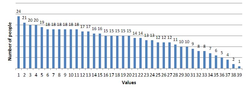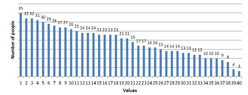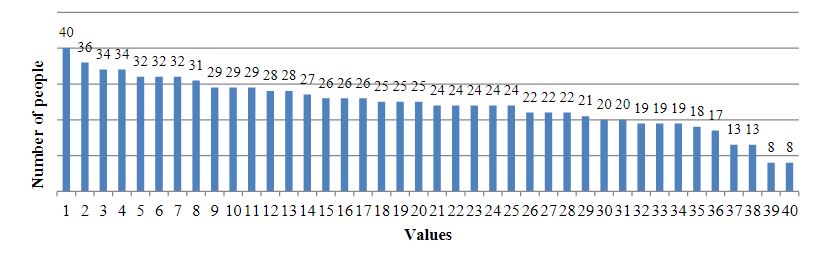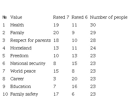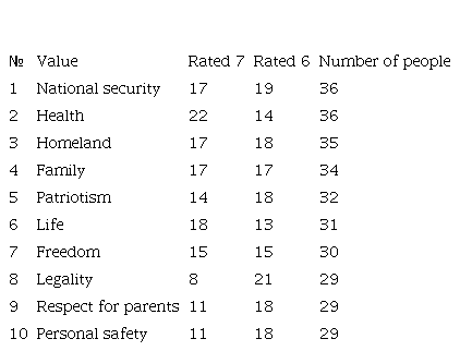 All students were asked to assess 40 values on the S. Schwartz scale: 7 – supremely important value as a guiding principle in life (usually there is one or two); 6 – very important; 5 – quite important; 4 – important; 3 – not very important; 2 – of little importance; 1 – not important; 0 – completely indifferent; -1 – opposite to your values. These 40 values included: 1) love, 2) freedom, 3) friendship, 4) family, 5) family safety, 6) life, 7) inner harmony, 8) good, 9) self-respect, 10) health, 11) life full of experiences, 12 ) world peace, 13) creativity, 14) education, 15) spiritual life, 16) self-discipline, 17) pleasure, 18) professionalism, 19) personal safety, 20) marriage for love, 21) politeness, 22) respect for the opinions of others, 23) equality, 24) the meaning of life, 25) respect for parents, 26) work, 27) career, 27) national security, 29) legality, 30) homeland, 31) respect for elders, 32) stability, 33) wealth, 34) duty, 35) patriotism, 36) respect for tradition, 37) sacrifice, 38) popularity, 39) power, 40) religion.