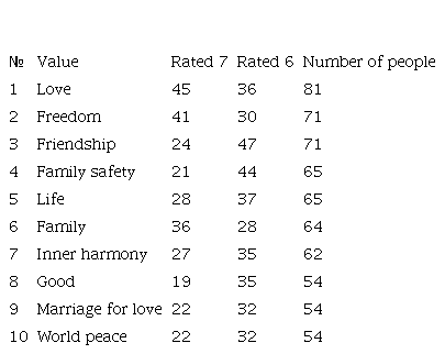 Thus, Russian students' top 10 leading (basic) values that were rated six or seven include: