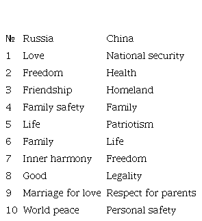 Common basic values for Russian and Chinese students are "freedom", "life" and "family", for Russian and Vietnamese students – "freedom", "family safety", "family" and "world peace", for Chinese and Vietnamese students – "freedom", "national security", "health", "homeland", "family" and "respect for parents". However, one should pay attention to the fact that these values hold different positions in the hierarchy of basic values. Thus, among the Russian respondents, "freedom" is in second place and in seventh among the Chinese; "family" ranks sixth in the value orientations of Russians and fourth for the Chinese. The value "life" for both the Russians and the Chinese ranks fifth and sixth (approximately the same result). The rest of the values of the representatives of these two nationalities do not coincide at all. The degree of importance of values within the same culture also changes. The traditional Chinese culture value "family" is no longer ranked first in the hierarchy of values among today's youth. The emphasis is shifting towards "national security", "health" and "homeland".