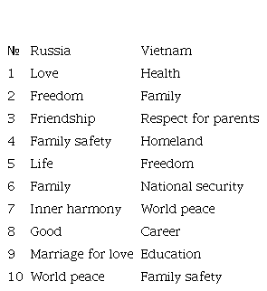 In the lists of values of Russian and Vietnamese students, there are more "overlapping areas", although the coinciding values occupy different lines in the hierarchy. "Freedom", which is in second place among Russian students, is in fifth place among Vietnamese. "Family safety" is in fourth place for Russian respondents and tenth for Vietnamese. Family plays a more important role for the Vietnamese than for the Russians (second place compared to sixth for the Russians). "World peace" is ranked seventh for Vietnamese audiences, while tenth for Russians, however, for Russian students, this basic value is closely intertwined with the others: "love", "freedom", "friendship", "life", "family safety", "good", "inner harmony". It should be noted that "education" was included in the list of basic values among the Vietnamese, while for the Russians this value did not receive seven or six points. This may be since Russian freshmen and sophomore students who entered universities after leaving school, do not yet realize the prospects that education gives them due to their age. Vietnamese students come to study in Russia, and for them, this is a serious, deliberate decision that requires a conscious approach. One can assume that for the Vietnamese students, the prospect of obtaining a higher education is already clear: a diploma from a Russian university makes it possible to get a good job at home. The value of "Health" is a priority for Vietnamese students: a healthy person can work hard and earn good money, provide for a family, the value of which is confirmed by the second place in the hierarchy.