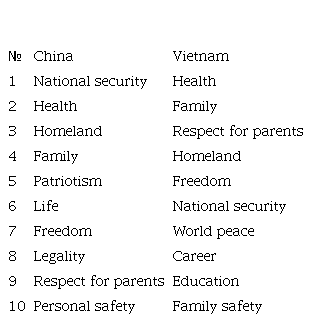In the list of basic values of Chinese and Vietnamese students, six out of ten values coincide. However, we should note that for Chinese students "national security" comes first, while for Vietnamese students it is in sixth place. The value of "health" is a priority for representatives of both cultures: second place in Chinese and first in Vietnamese. The value of "homeland" is important for the representatives of these nationalities. It ranks third among the Chinese ("national security" ranks first), while among the Vietnamese it is fourth. For students from Vietnam, traditionally the main concept is the family. For them, the Homeland is a big family. Vietnamese students put this value in second place, and Chinese students in fourth (the emphasis is shifted in favor of "homeland"). The values "freedom" and "respect for parents" are among the ten basic values but these values also occupy different places in the hierarchy: in the Vietnamese audience, their significance is higher.