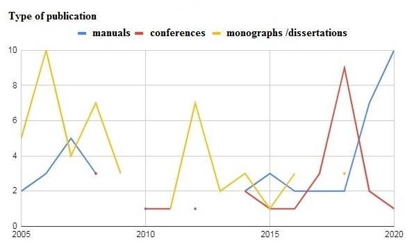 Hence, we have studied the collections of the electronic funds of the Russian State Library, which amount to about 1.5 million titles. There have been disclosed 77328 relevant publications within the time period of 1995-2020. The first publications came out in the late 90s of the 20th century, high intensity of relevant publication activity is related to the first fifteen years of the 21st century. The monographs, dissertations, scientific journals covered the theoretical aspects of the problem from the positions of Russian and foreign scientists, the first practical educational methodological manuals started to come out in the beginning. At present research-to-practice conferences have also been intensively held.