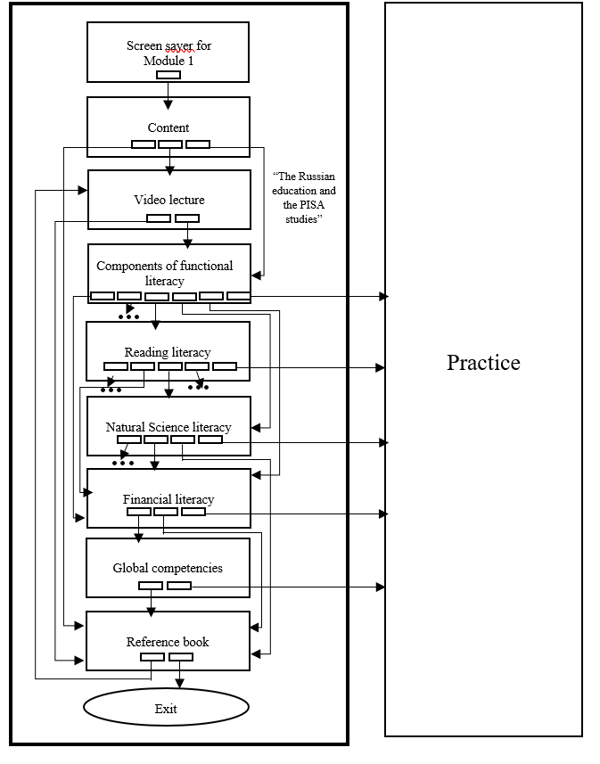 The profile (disciplinary-methodological) part contains themes revealing the model for evaluating educational achievements in accordance with the Federal State Educational Standards of general education, the assessment of meta-subjective and personal results, intra-school control as a mechanism for practically improving education quality, and the methodology for designing competence-oriented tasks. The course ends with the completion of project work. In fact, the course is lacking in addressing the relevant issues of modernization of teacher activities in the context of functional literacy.