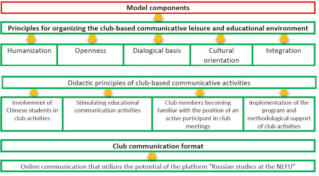 At the initial stage of its implementation, the project to create a communication club in Russian required developing a theoretical model for this form of teaching foreign students. The model should consider the conditions of leisure and educational activities aimed to promote the Russian language outside of Russia. The social and public significance of the model for the implementation of the Almaz Russian-language Russian-Chinese communication club in the context of interuniversity Russian-Chinese educational relations in modern conditions consists in popularizing the Russian language and educational programs in Russian for foreign students, as well as creating an open educational environment, contributing to the acculturation of Chinese students (Anderson & Guan, 2017; Zhu, 2016), their adaptation in a foreign-language cultural space, increasing their interest in studying the Russian language, literature, culture, and history, and improving the scientific and educational-methodological base of learning Russian as a foreign language (RFL).