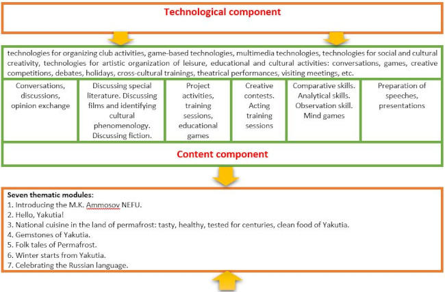 Abstract: The study deals with the issue of applying the communicative club format for organizing leisure, educational, and cultural activities for foreign students interested in the Russian language. The authors describe the structural and content model of the Almaz Russian-language Russian-Chinese communication club created based on centers for the Russian language, literature, and culture at the Ammosov North-Eastern Federal University. The model includes target, technological, and content components and implementation mechanisms. The authors conclude that interactive technologies of leisure show great potential for developing foreign students' communicative competence and creative abilities and enriching the individual with knowledge about the traditional culture of peoples inhabiting the multicultural territory of Russia.