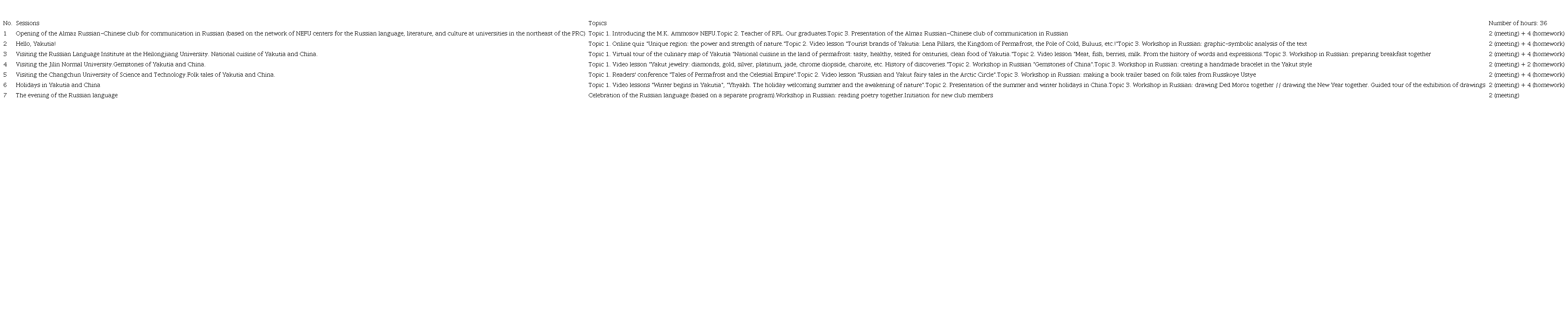 The club meeting schedule consists of seven self-sufficient modules – sessions of the communication club for Chinese and Russian students and specialists in Russian studies. Each module includes an extensive roster of relatively independent teaching and educational topics.