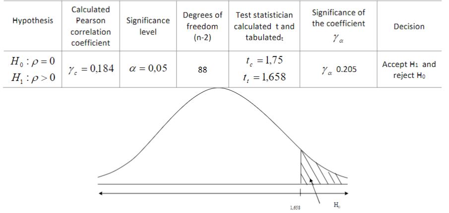 It is noted in table 4, that the significance of Pearson's correlation coefficient is less than the calculated value (andα x 0.195); this result is evident in the Gaussian curve shown, where the calculated t-Student test statistic (tc s 1.86) is greater than the critical value (tt x 1,658), deciding to reject the null hypothesis (H0: p x 0) and accept the alternating hypothesis (H1: p). that the relationship between the educational dimension of the university didactics of teachers is partially direct and insufficient (and > 0c x 0.195) with respect to the dimensional skills: epistemological, cognitive and methodological studiesof the viii, IX and X program cycle
