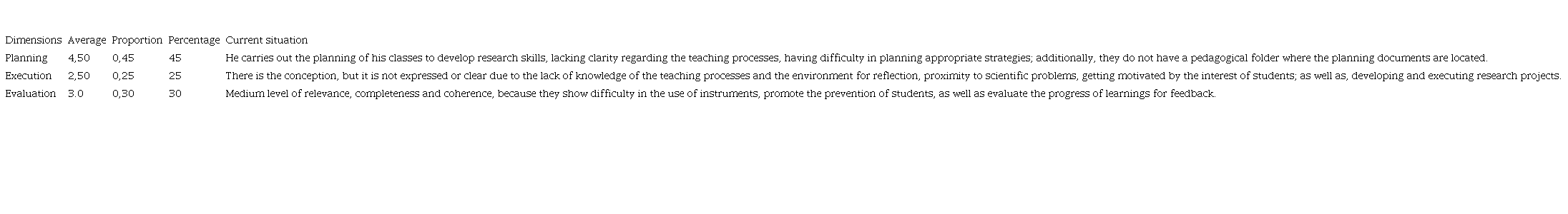 It is results consistent with that found by Ascencio (2016), who considers that the class plan is always the ideal instrument for the planning of a course, which integrates the activities that must be carried out before the session, at the beginning, during the development and in the closure of the same. This document should be prepared for each session of the subject; However, it is complicated, because in one semester you can re-enter more than 50 class plans if, for example, a subject is taught 3 times a week over 16 or 18 academic weeks.