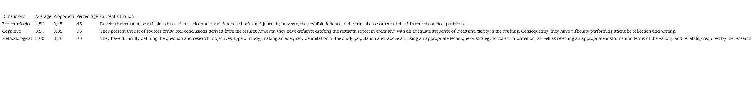In addition to this, Campo (2018) states that, if students were able to acquire these competencies, they would develop, more easily, scientific work and could disseminate results from their research, participate in congresses and publish in scientific journals; activities that will not only contribute to their good academic performance, but also to generate and update knowledge in their area of study, as well as consolidate the institution in the university.