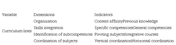 Table 1 shows the variable curricular lines based on their dimensions and indicators. The operationalization of this concept is of paramount importance for the full understanding of its definition, and its subsequent linkage with competences.