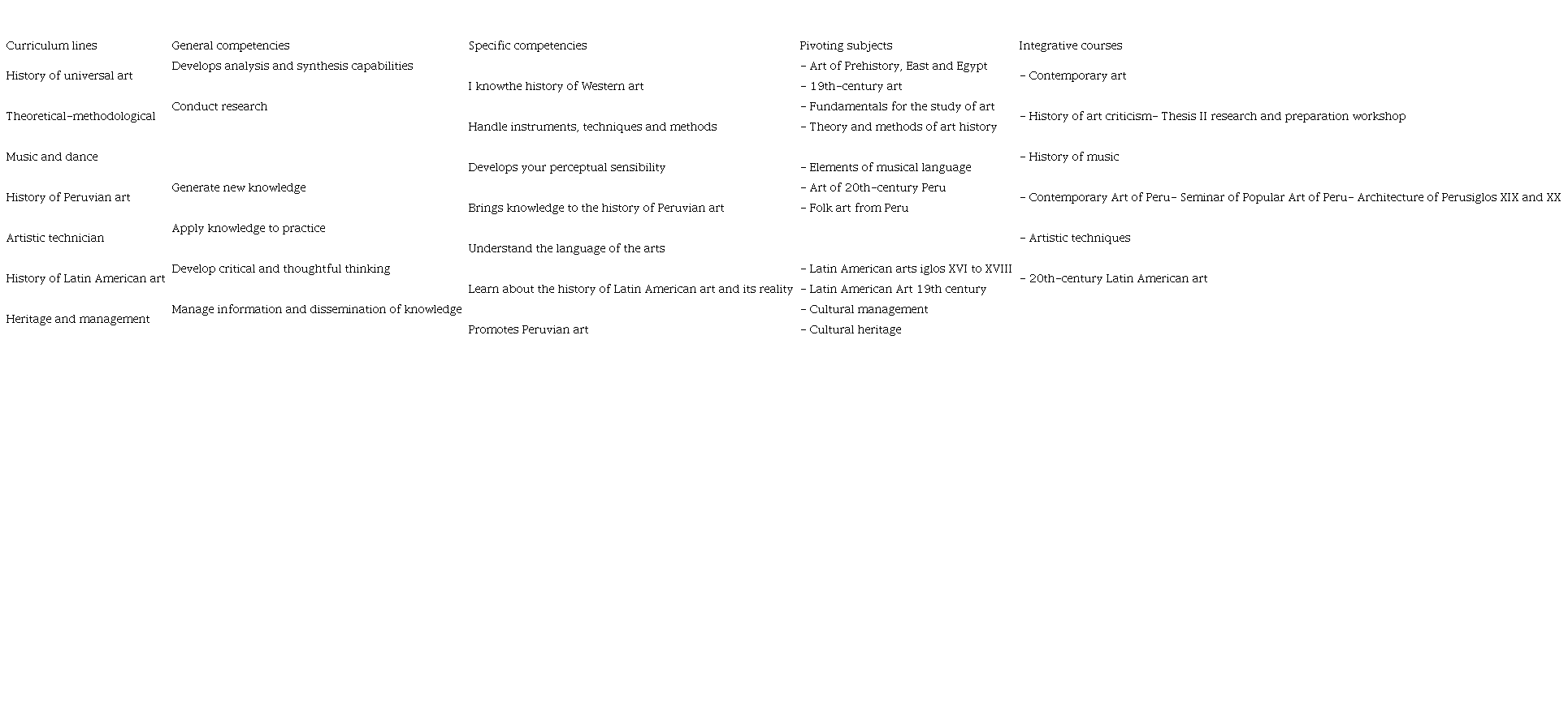 The curriculum of the Professional School of Art provides three curricular lines with limited number of subjects: the line of music and dance, with two courses; the technical-artistic line, with a course, and the heritage and management line, with two courses. This is an inconvenience to the appropriate approach of general and specific competencies of these lines, which also falls on the difficulty in identifying your pivot subjects and integrative courses.