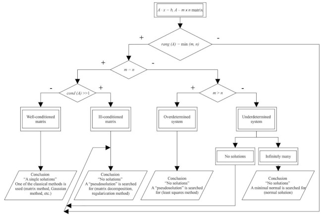In practice, as shown by the above examples, the systems are frequent in which the coefficient matrix is singular or ill-conditioned, often rectangular. Obviously, it is crucial to know the specific features of searching for their solutions. Although the first two types of equations systems significantly differ from each other (the systems with singular matrix have no solution, while the systems with ill-conditioned matrix it exists and it is unique), from the computational point of view they are almost the same. To solve them, a simple but very effective Tikhonov’s regularization method is used, based on referring to additional a priori information on the solution, which is often available in practical cases. Another effective method is to use an orthogonal matrix decomposition. As a rule, after a certain decomposition of a matrix, SLAE solution becomes significantly simpler. One of the most popular modern algorithms of arbitrary SLAE solution is singular value decomposition (SVD).